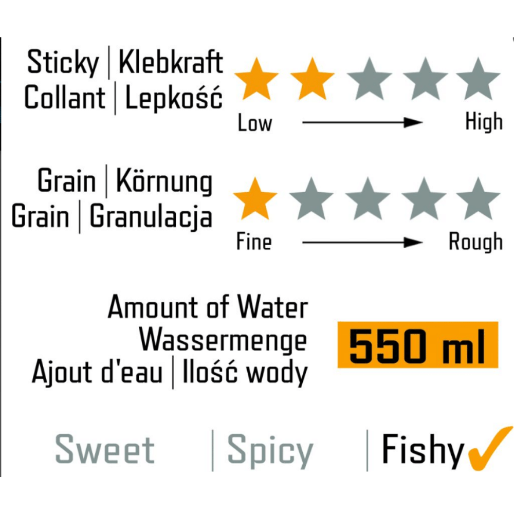 Die dunkle Farbe erhält das Futter durch feinste Fischmehle. Der fischige Geruch mit einer dezenten Note von süßem Biskuit lockt vor allem große Fische schnell an und hält sie lange Zeit am Futterplatz.